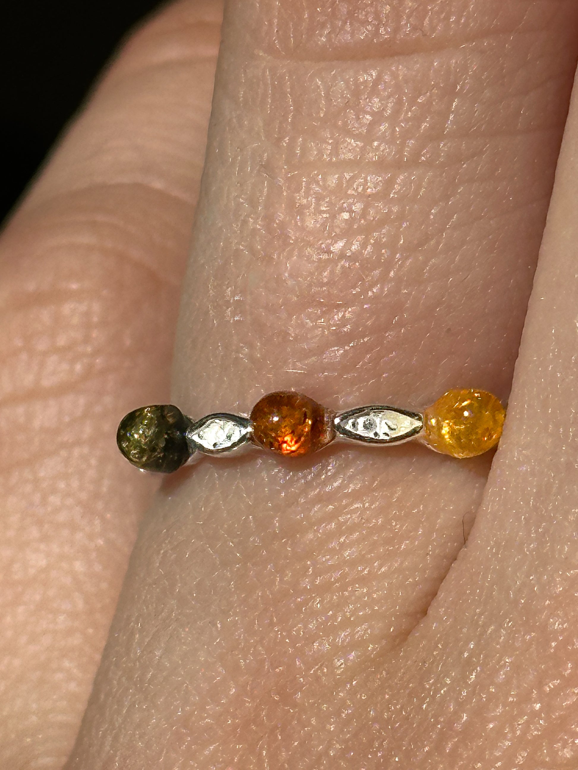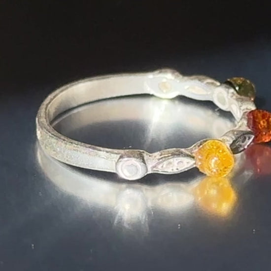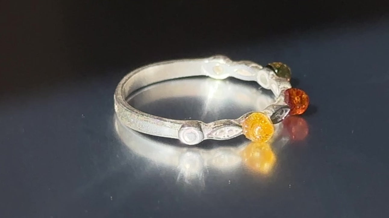 Žaismingas ir subtilus, šis plonas sidabrinis žiedas puoštas trimis mažyčiais kontrastingų atspalvių gintaro akmenėliais – subtiliu spalvų, šilumos ir šviesos deriniu. Puikiai tinka nešioti vieną arba vieną, suteikiantį natūralaus žavesio.