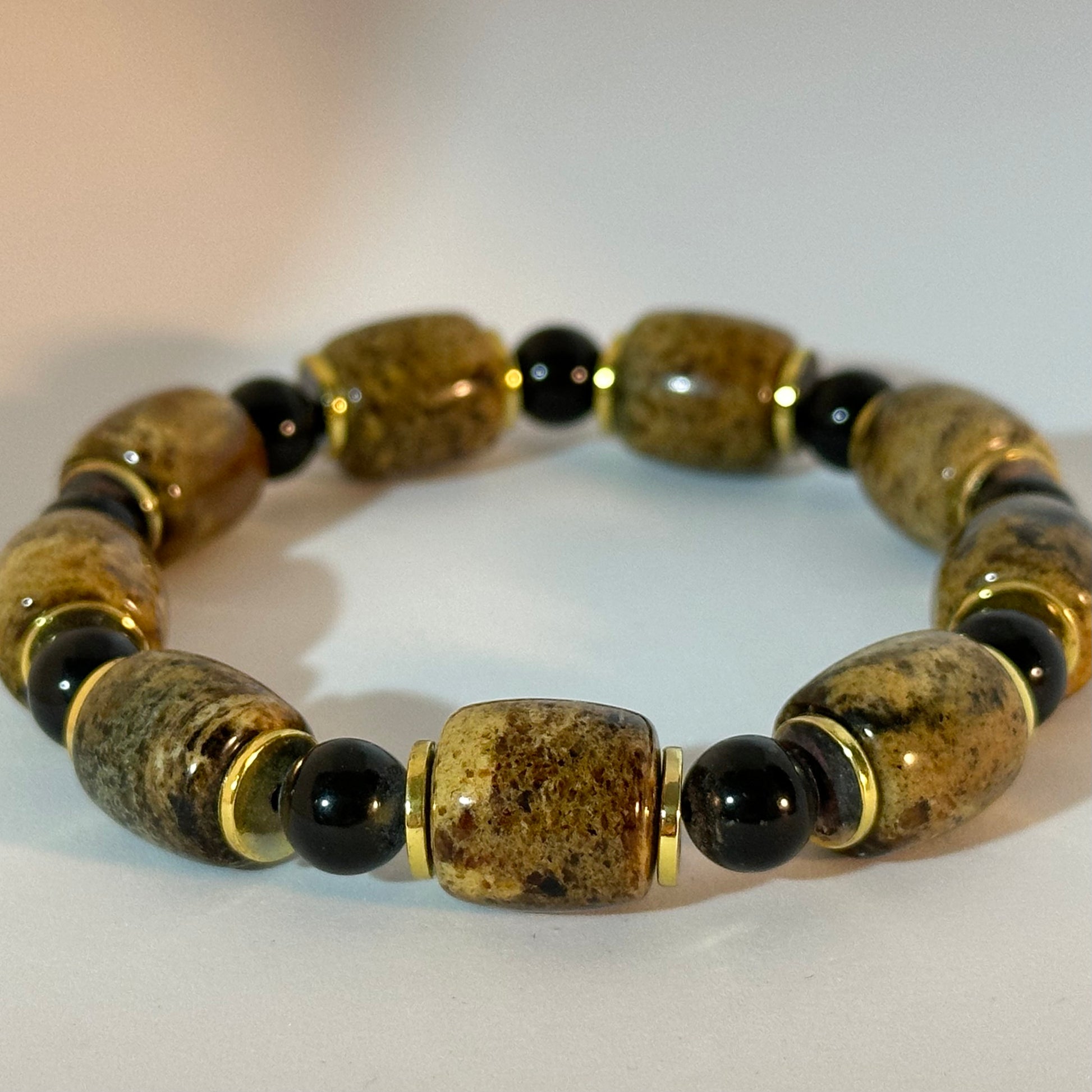 Šios žavingos gintaro apyrankės – drąsus ir išskirtinis aksesuaras, kuriame šiltas gintaro švytėjimas dera su įspūdingais juodais karoliukais ir prabangiais aukso akcentais. Netradicinis dizainas išsiskiria tvirtumu ir individualumu, tapdamas tikru dėmesio centru. Persmelkta senovės kultūrų dvasia, ši apyrankė neša istorijos ir paslapties jausmą, todėl ji puikiai tinka tiems, kurie vertina unikalius, prasmingus papuošalus, turinčius charakterio ir gilumo.