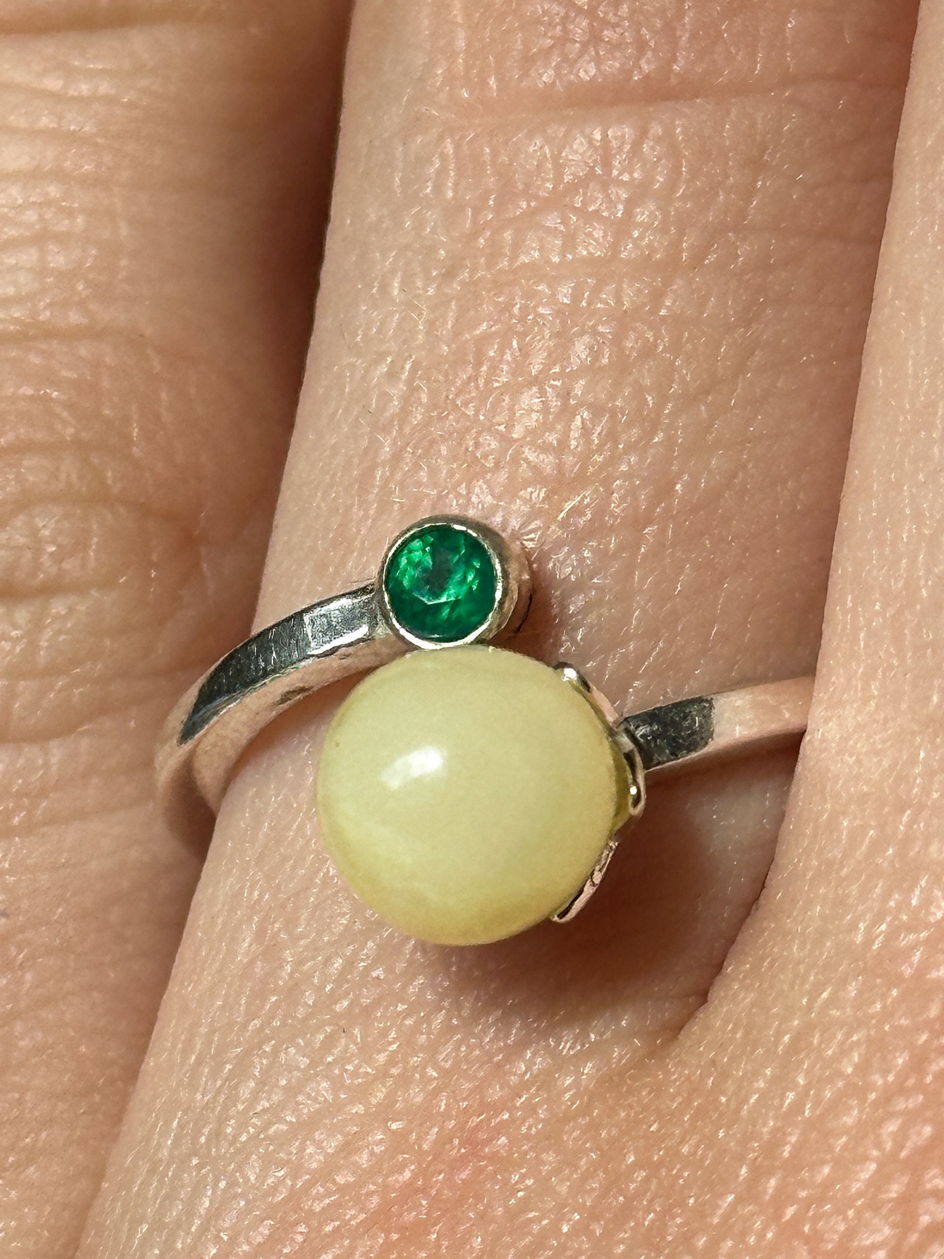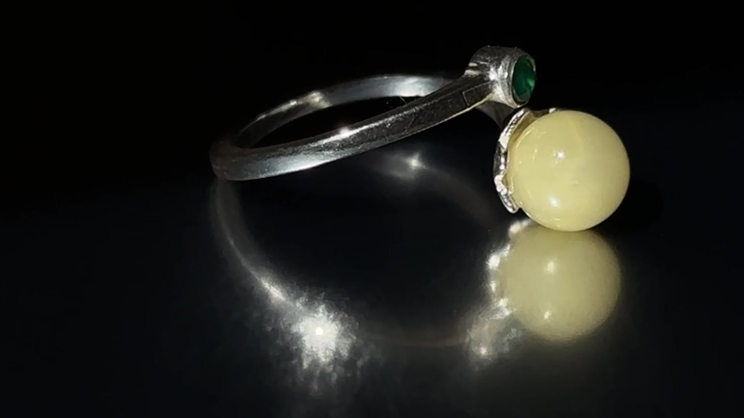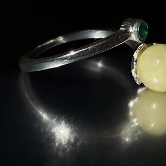 Organiškas ir raminantis, šis reguliuojamo dydžio sidabrinis žiedas derina pienišką baltumo gintarą su tamsiai žaliu akcentiniu akmeniu. Įkvėptas ramios gamtos pusiausvyros, tai švelnus, tačiau išskirtinis papuošalas, suteikiantis šviesos ir harmonijos jūsų kasdieniam įvaizdžiui.