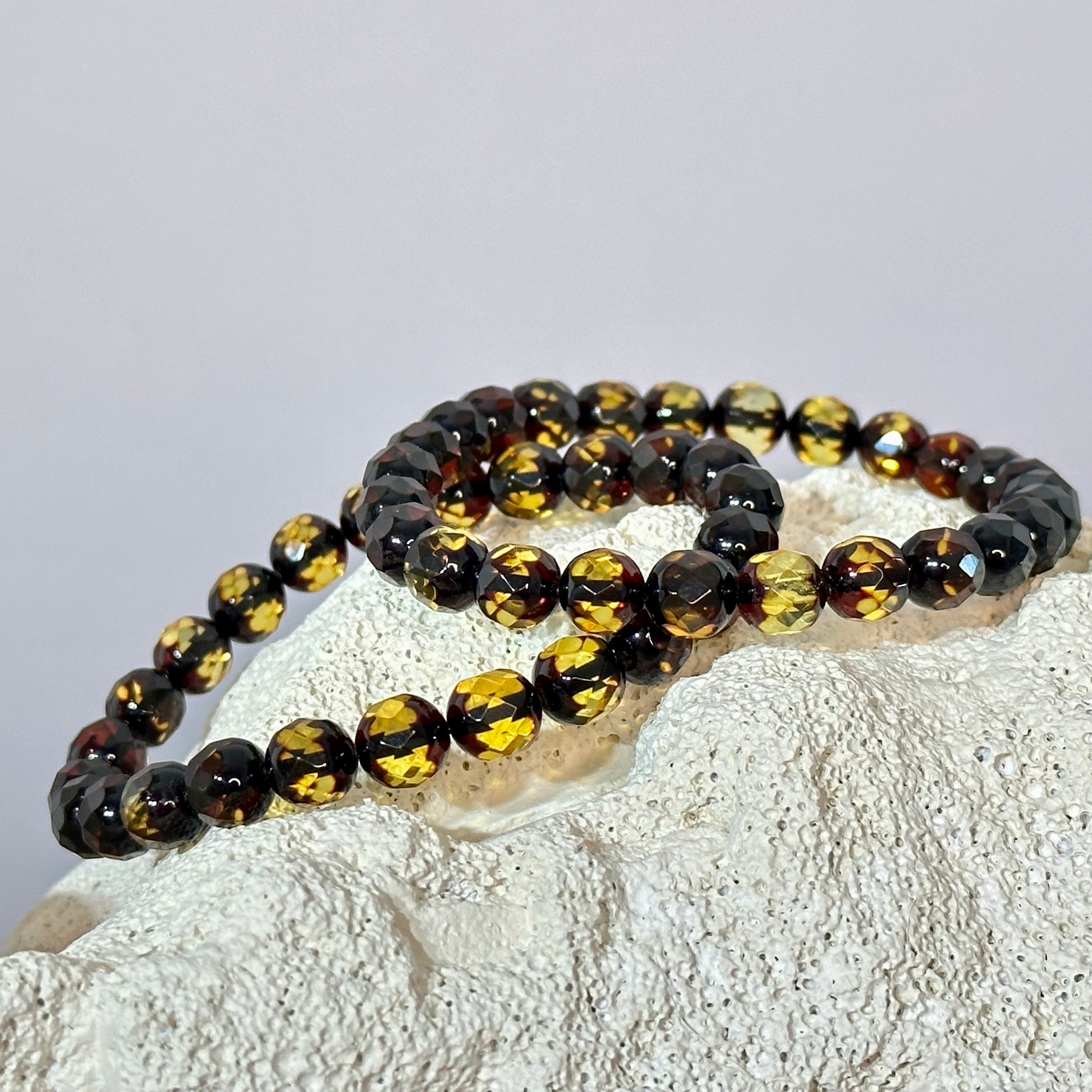Tobulai apvalūs žali gintaro karoliukai, meistriškai briaunoti taip, kad sukurtų akinantį deimantų efektą. Kiekvieno karoliuko kampai atspindi šviesą, suteikdami šiam elegantiškam kūriniui rafinuoto blizgesio. Sudėtinga briaunų struktūra išryškina natūralų gintaro grožį, o harmoninga dizaino kompozicija ir prabangi išvaizda paverčia apyrankę išskirtiniu aksesuaru, kuris puikiai tinka bet kokiai aprangai ir paryškina ją subtiliu, tačiau įspūdingu blizgesiu.