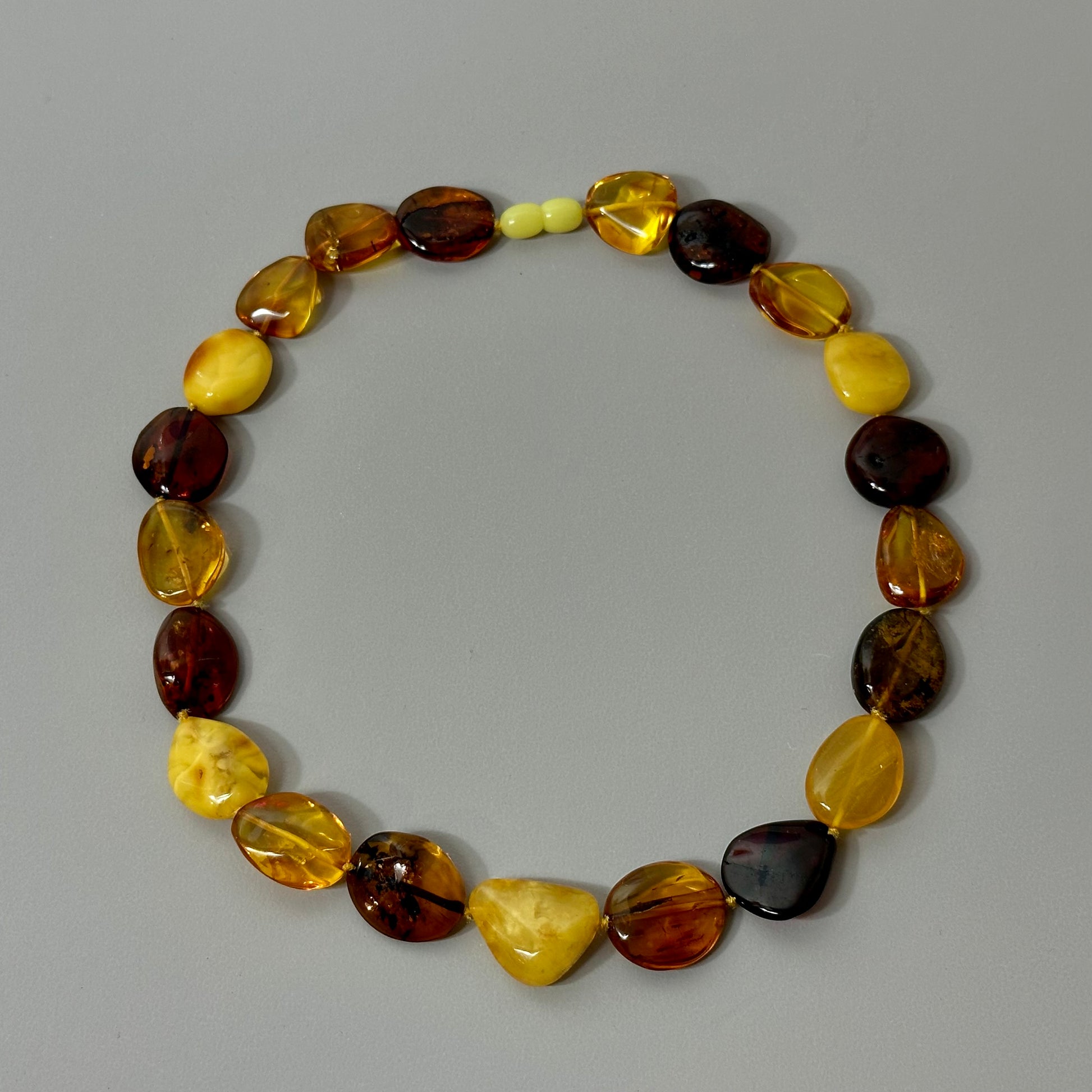 Šie įvairiaspalviai gintaro karoliai išsiskiria įvairių formų deriniu – nuo švelnių apvalių iki ryškių trikampių detalių, sukurdami žavingą formų žaismą. Tai puikus paveldo ir šiuolaikinio kūrybiškumo derinys, pridedantis šilumos ir charakterio apgalvotam stiliui.