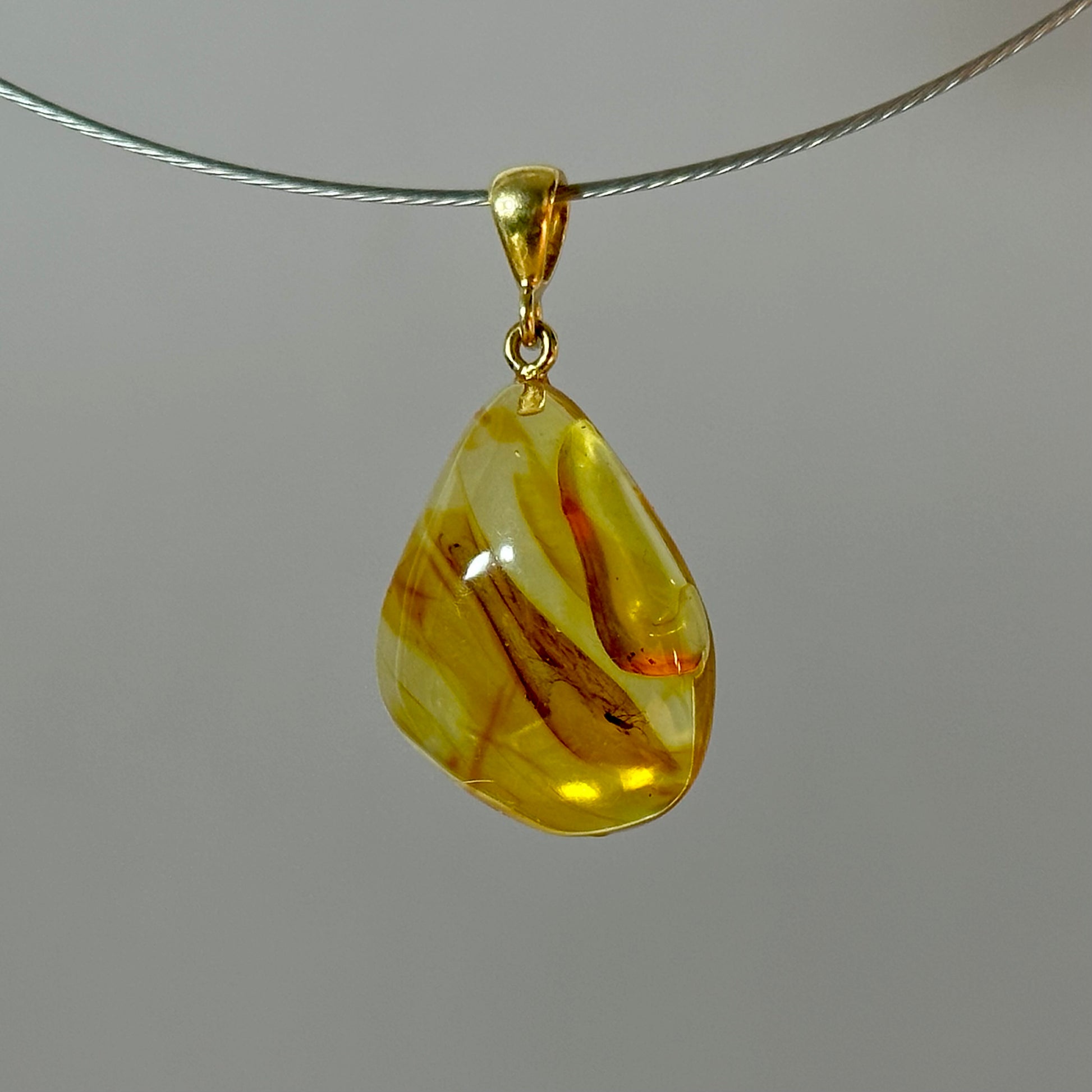 Šis skaidraus gintaro pakabukas pasižymi besisukančiais geltonos ir konjako spalvos tonais, primenančiais skaisčią degančios saulės šilumą. Gintaras atgyja saulės šviesoje ir įgauna nuostabų, ugningą švytėjimą. Šis unisex dizaino pakabukas yra universalus, tačiau drąsus, todėl jis yra idealus aksesuaras kiekvienam, kuris vertina įmantrius gamtos raštus ir nesenstančios elegancijos dvelksmą. Gintaras savyje turi vabzdžio inliuzą.