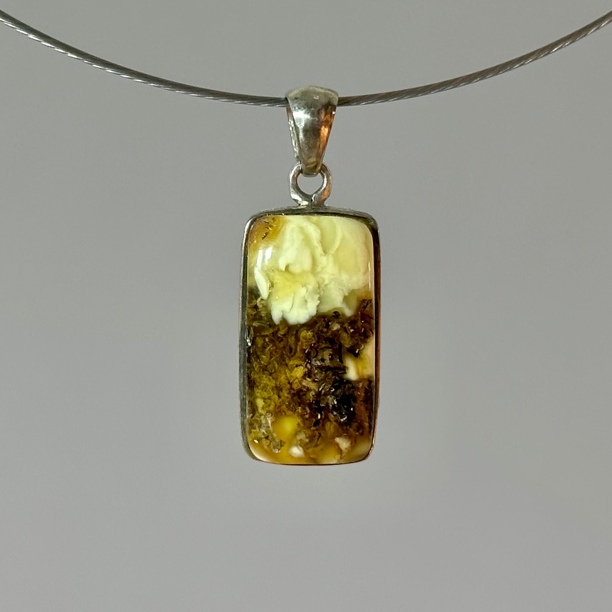 Šis elegantiškas, stačiakampio formos gintaro pakabukas spinduliuoja paprastumu ir rafinuotu natūralumu. Gamtos sukurtas dizainas suteikia vaizduotei neribotas galimybes, bandant perprasti gintaro turinį. Jo unisex dizainas yra universalus, o gintaro atspalvių mišinys, tarsi tekantis per visą akmenį, sukuria turtingą ir dinamišką įvaizdį. Su savo kukliu, tačiau žaviu stiliumi, šis pakabukas puikiai tinka tiems, kurie vertina natūralų grožį ir minimalizmą.