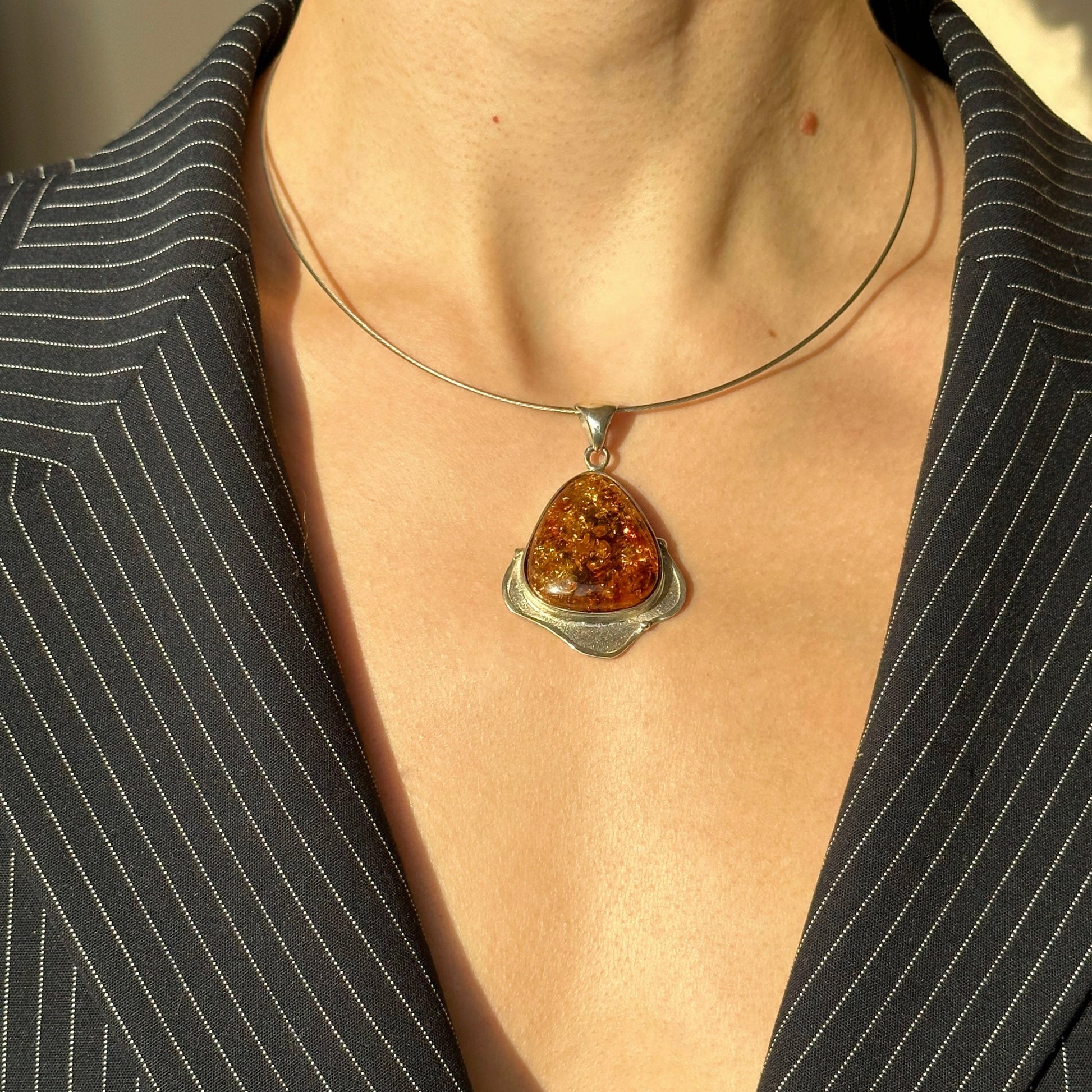 Šis elegantiškas konjakinės spalvos gintaro pakabukas pasižymi subtiliu, bet rafinuotu dizainu, o šilti gintaro tonai suteikia jam gilumo. Paprastas, švarias pakabuko linijas sustiprina rafinuotas sidabrinis apvadas, sukuriantis nesenstantį ir prabangų kūrinį. Dėl nepaprasto grožio jis yra puikus aksesuaras ieškantiems elegancijos.
