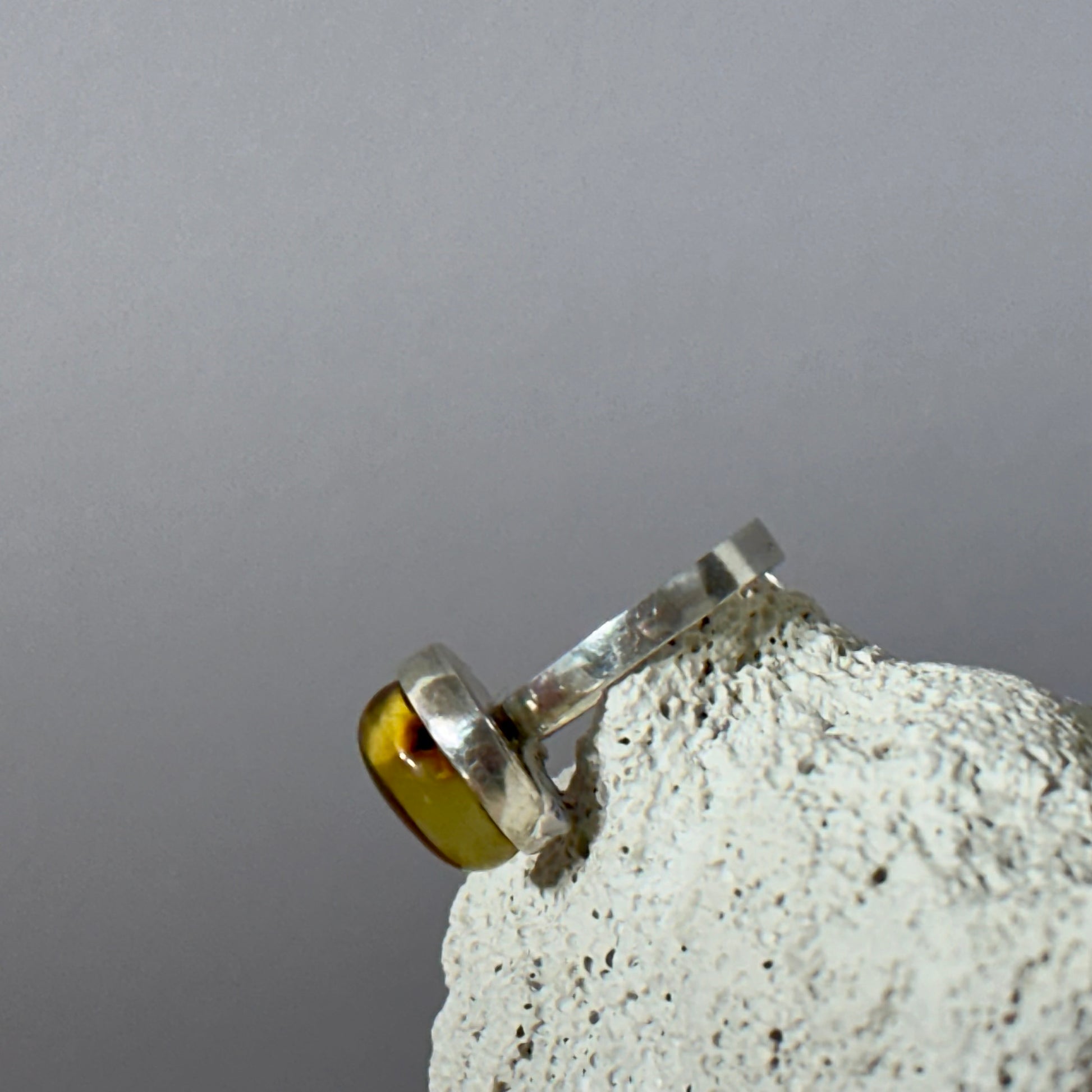 Šis apvalus konjako gintaro žiedas – tai įspūdingas derinys tarp gamtos grožio ir paslaptingos elegancijos. Gintaro šiltos, gilios spalvos žaismingai atspindi šviesą, o unikalus intarpas – ar tai akmuo, ar mediena – suteikia žiedui nepakartojamą charakterį ir intrigos. Ši išskirtinė detalė ne tik pagyvina dizainą, bet ir paverčia žiedą tikru meno kūriniu, kuris atskleidžia subtilią grožio ir natūralumo harmoniją. Tai papuošalas, kuris ne tik prikausto žvilgsnį, bet ir pasakoja savo unikalią istoriją, suteikdamas išskirtinio žavesio.