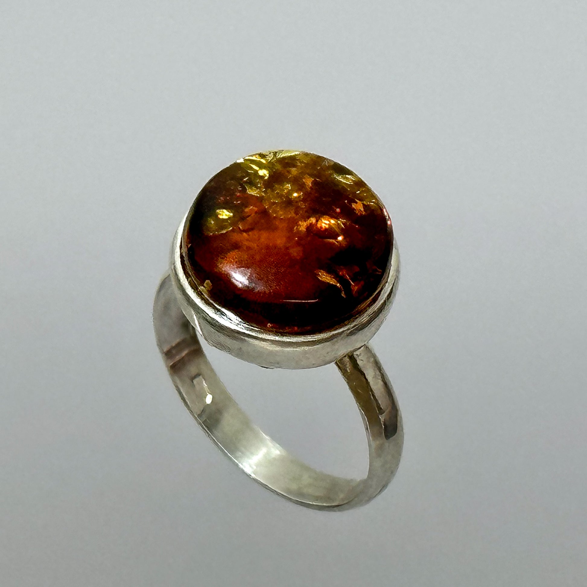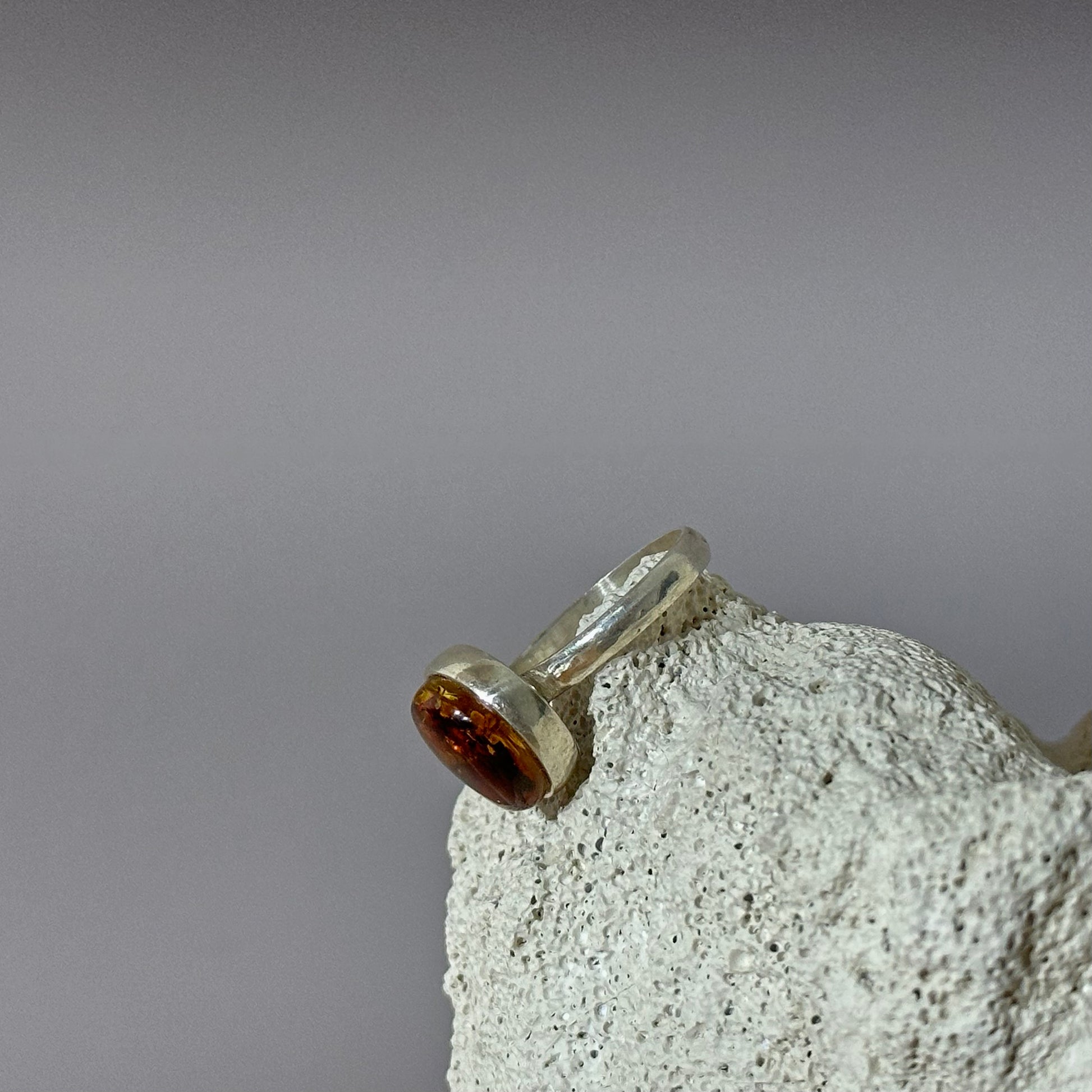 Šis apvalios formos konjakinio gintaro žiedas sužavi išskirtiniu sudužusio stiklo efektu, kuris subtiliai jungia modernią intrigą su nesenstančiu žavesiu. Gintaro šiltos, saulės atspindžius primenančios detalės harmoningai dera su klasikiniu dizainu. Tai žiedas, kuris pasakoja apie grožio ir paslapties harmoniją.