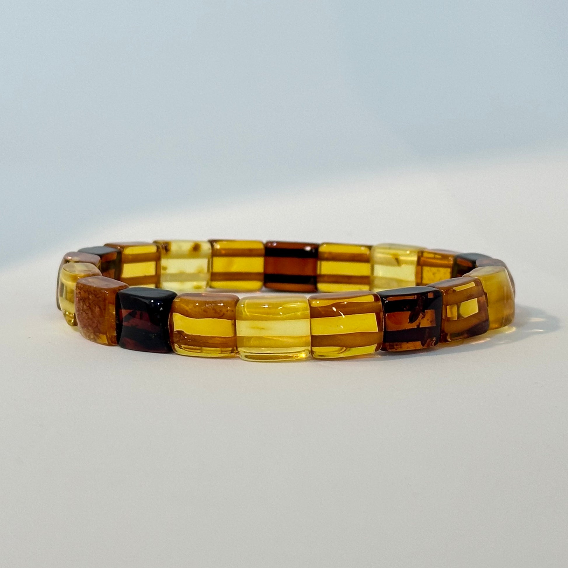 Ši smulki apyrankė išsiskiria subtiliu, plonu dizainu, kuriame puikiai išpjauti gintaro akmenys spinduliuoja šiltais, natūraliais atspalviais. Kiekvienas akmuo yra kruopščiai suformuotas, kad išlaikytų tobulą formą ir sukurtų aptakų, minimalistinį vaizdą.